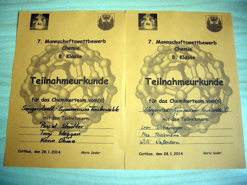 Sechs Schüler aus der 8. Jahrgangsstufe machten sich auf den Weg nach Cottbus zur Chemie-Olympiade. Diese Schüler hatten sich schon einige Wochen vorher mit zusätzlichen Chemiestunden, die Frau Freese durchführte, darauf vorbereitet.
