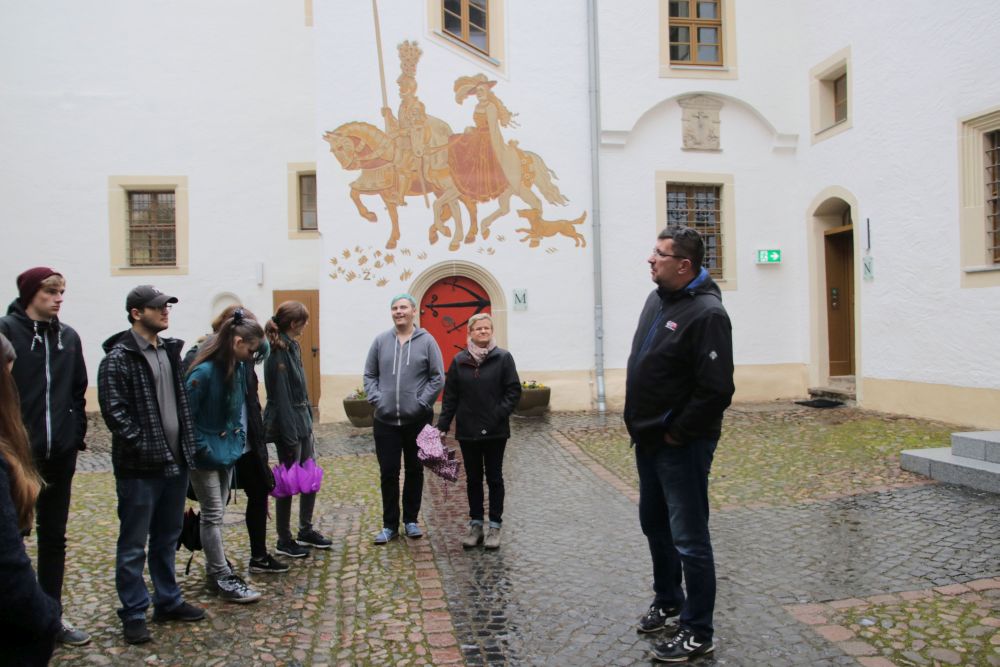 Unsere Führung brachte uns vom Marktplatz aus zuerst zur Trinitatiskirche, in die wir auch Einblick bekamen, und anschließend zum Schloss, welches eigentlich eine Burg ist, wie wir erfahren konnten. Abschließend sahen wir uns noch das Wasserspiel hinter der Kirche an. Trotz schlechter Bedingungen mit Nieselregen konnten wir viele Informationen über diese Bauwerke erhalten und wir wurden auf verschiedene bauliche Merkmale hingewiesen, die einem vorher im Vorbeigehen noch nie