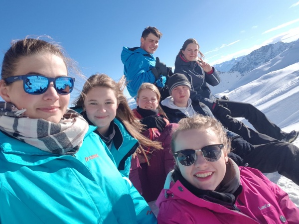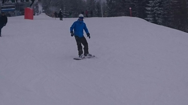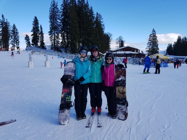 Am nächsten Morgen ging es pünktlich mit dem Bus los zur Piste. Voller Erwartungen und vollkommen beeindruckt vom Panorama kamen wir wenig später am Hausberg an. Nun wurden wir in die Gruppen aufgeteilt und ab ging´s mit der Gondel hoch auf die Piste. Oben angekommen bildeten die Snowboarder einen Aufwärmkreis, um sich erst einmal richtig warm zu machen, bevor sie sich die Bretter anschnallten. Gerade bei den Anfängerkursen kam es anfangs öfter zu kleinen Unsicherheiten und Stürzen. Doch eifrig und weiterhin motiviert versuchte man, langsam aber sicher ein Gefühl für die Ski zu bekommen. In den Kursen für Fortgeschrittene fand man nach einer kurzen Eingewöhnungsphase