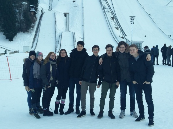 Jugendherberge an. Das erste Highlight war der Fahrstuhl. So konnten wir bequem und zügig die Sachen in unseren Zimmern unterbringen. Da nur wenige die erforderlichen Utensilien für das Ski- und Snowboardfahren besitzen, machten wir uns auf den Weg zur Skischule Alpin. Nachdem auch diese Hürde überstanden war, sahen wir uns die Skisprungschanze von Garmisch-Partenkirchen an. Dieser Anblick war großartig. Um 18.00 Uhr gab es dann endlich Abendessen. Den ersten Abend ließen wir alle gemütlich ausklingen, um für den nächsten Tag fit zu sein.