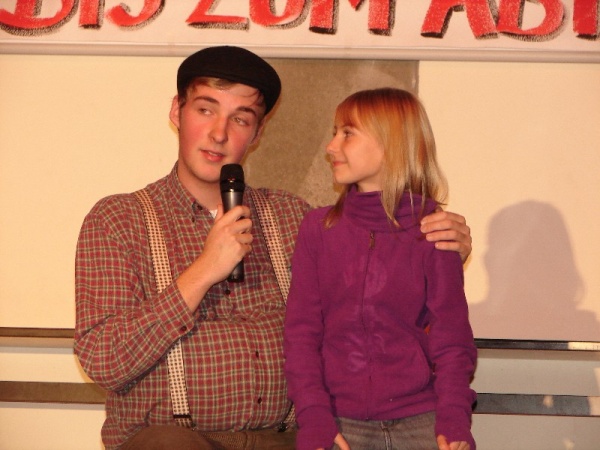 Julia Löwa sang im ,,Lied der Marie“ von ihrer sehnsuchtsvollen Liebe und ,,I`m not a girl“ gaben Johanna Piater und Sarah Balke Britney Spears. Zum umjubelten Auftritt brachte es Jonas Pantzer aus der 12. mit dem Song vom schönen Leben, ,,Es ist herrlich in Berlin“ aus dem Musical ,,Linie 1, das er der kleinen Lara vorschwärmte.Während Justus Berger, Paul Kaiser und Pius MaderSchwerstarbeit an der Technik zu leisten hatten, schwebten Lara Löser und Hannah Joachim als kleine Tänzerinnen lateinamerikanisch graziös und gekonnt über die Bühne. Mädchenherzen wurden schwach, als Vu Viet Phuon romantisch ,,Another Brick in der Wall“ sang und sich selbst auf der Gitarre dazu begleitete, bevor der 13er Kurs mit Maria Schubert und Chris Burdack an den Mikros die ,,Summer Nigh“ in Erinnerung riefen. Die Schulband mit Bandleader Jonas Gallin sprach kräftig dem ,,Ouzo“ aus der Musical-Variante von ,,Der Schuh des Manitu“ zu. Als Paul Biesoldund der 12er Kurs mit ,,Always look in the Bright side if Life“ einen stimmungsvollen Schlusspunkt setzten, war der bolivianische Gastschüler Carlos Bonfiglior Bicker stimmkraftig voller Spaß dabei. Anstatt einer üblichen Bühnenausstattung hatte Thomas Lehmann mit einer begleitenden Power Point Präsentation für stimmungsvolle und romantisch-poetische Bilder gesorgt.